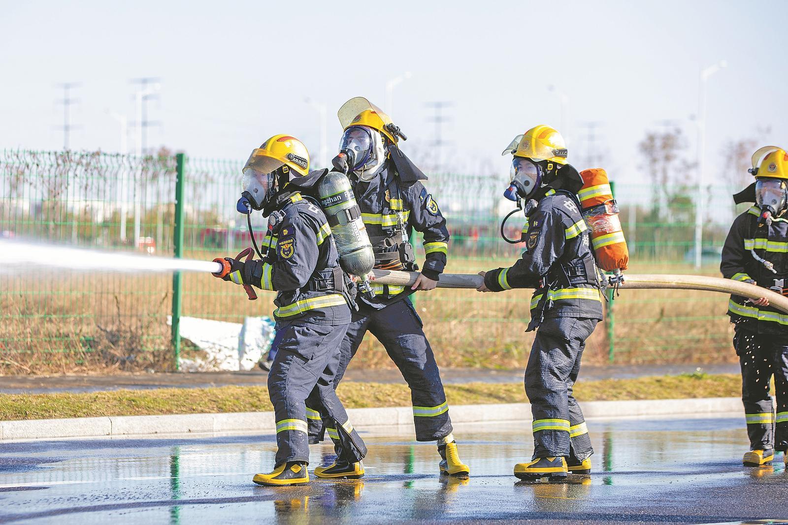 11月19日,消防部门参加联合武器训练比赛。 18日,一场为期两天的全市消防救援队伍全体队员训练活动开始。来自全市消防局14个参赛队的170名消防队员和救援人员,进行了4×200米游泳、武器协调训练、一人2碗水带连接训练等14个题目的比赛。此次活动旨在强化全体员工素质,提高整体应急救援能力。图片提供:全媒体记者李旭辉、通讯员苏晓杰。
